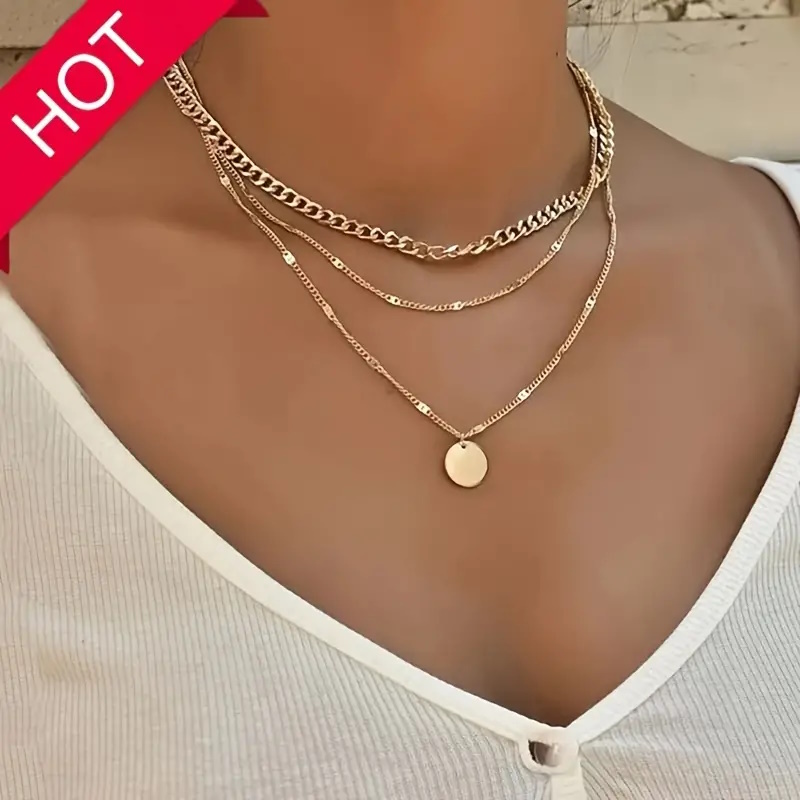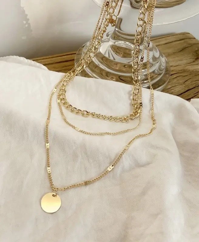 3 Ketten zu einem Trio vereint. Ein kleiner runder Plättchenanhänger runden das Gesamtbild harmonisch ab.